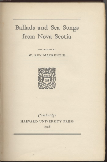Title page from the book, Ballads and Sea Songs from Nova Scotia, by W. Roy Mackenzie, (London: Oxford University Press, 1928) |