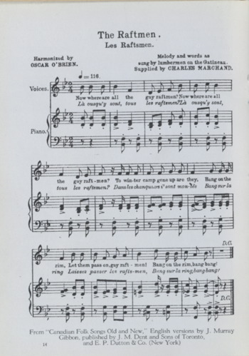 Music and Lyrics to Les Raftsmen, English version of which was written by John Murray Gibbon, as printed in the program for the Canadian Folk Song and Handicrafts Festival organized by Gibbon at the Chateau Frontenac in Quebec City, May 20-22, 1927, page 14 |