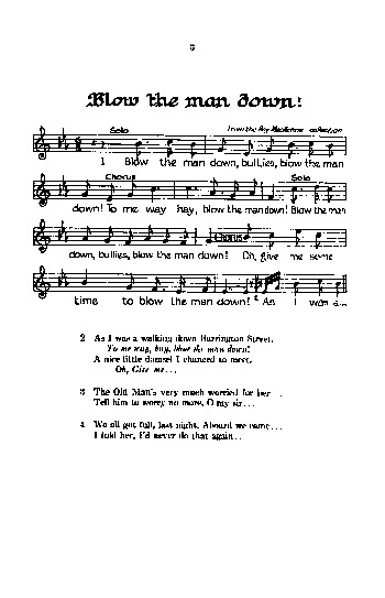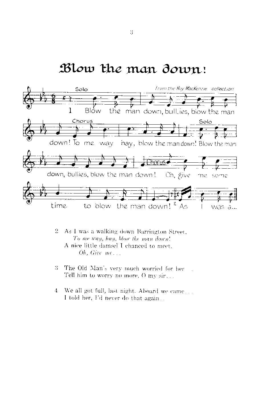Music and lyrics for Blow the Man Down, as printed in Come ‘A Singing: Canadian Folk-Songs, Facsimile Edition, compiled by Marius Barbeau, Arthur Lismer and Arthur Bourinot, (Ottawa: National Museums of Canada, 1973), page 3 |