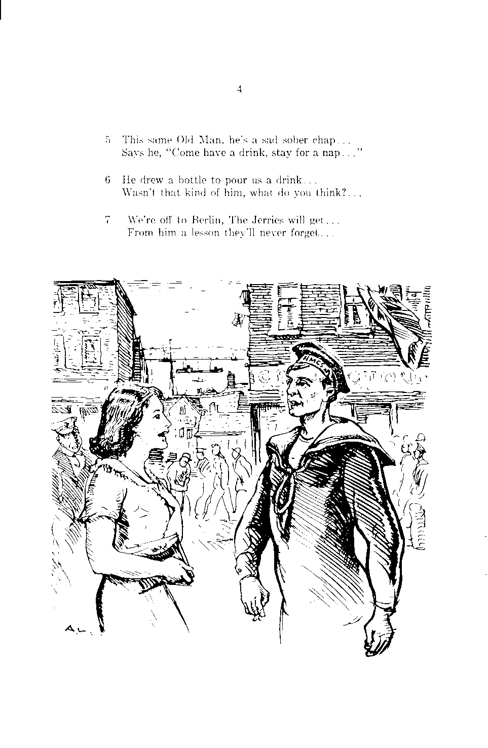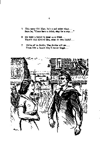 Lyrics of Blow the Man Down (continued) and an illustration by Arthur Lismer, as printed in Come ‘A Singing: Canadian Folk-Songs, Facsimile Edition, compiled by Marius Barbeau, Arthur Lismer and Arthur Bourinot, (Ottawa: National Museums of Canada, 1973), page 4 |