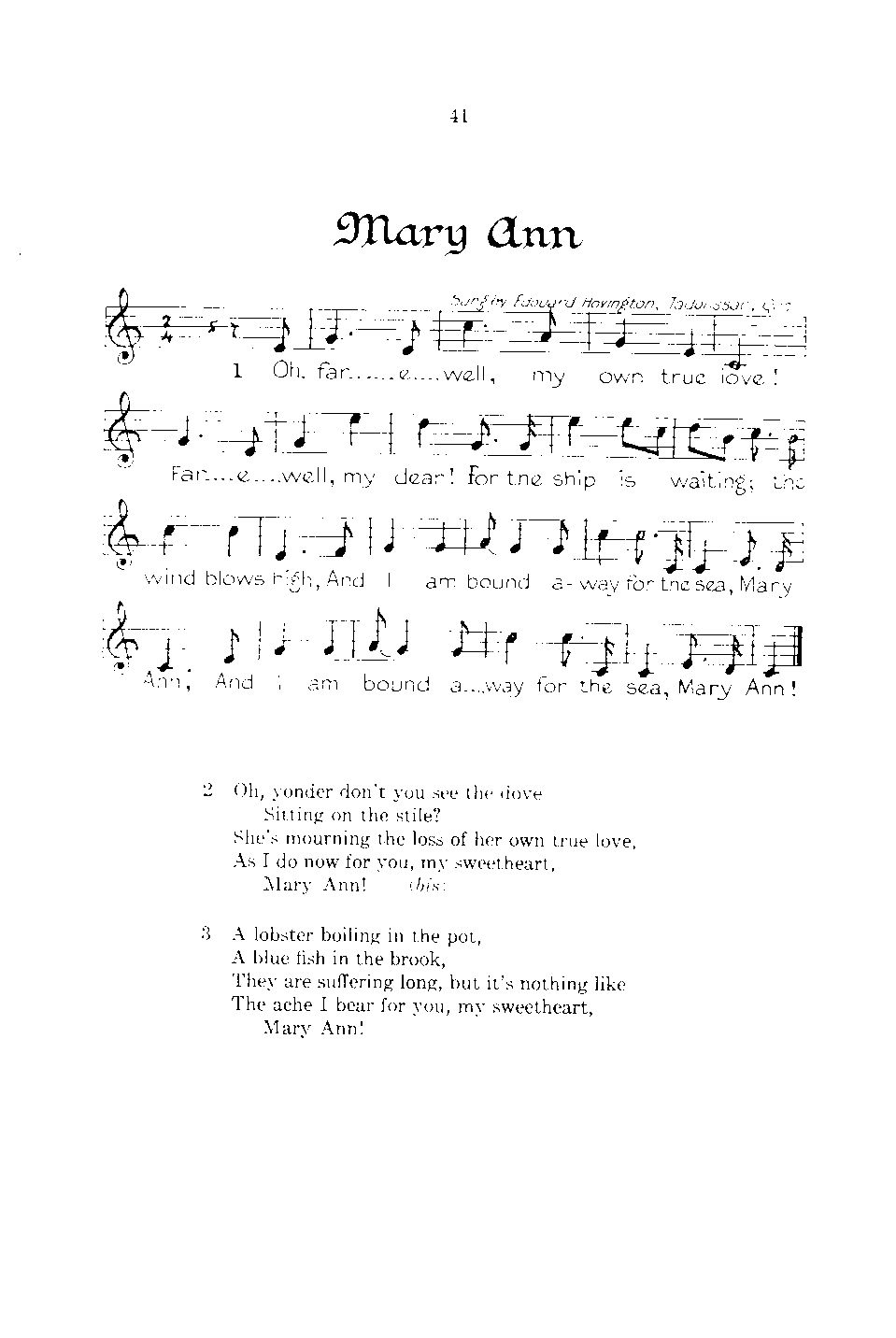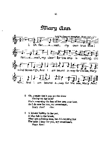 Music and lyrics for Mary Ann, as printed in Come ‘A Singing: Canadian Folk-Songs, Facsimile Edition, compiled by Marius Barbeau, Arthur Lismer and Arthur Bourinot, (Ottawa: National Museums of Canada, 1973), page 41 |