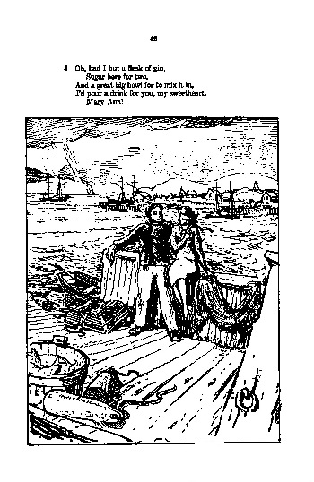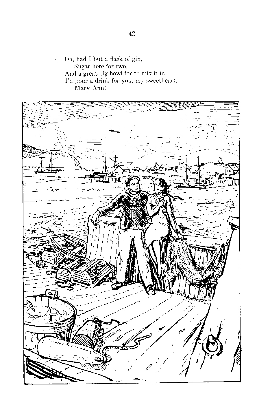 Lyrics of Mary Ann (continued) and an illustration by Arthur Lismer, as printed in Come ‘A Singing: Canadian Folk-Songs, Facsimile Edition, compiled by Marius Barbeau, Arthur Lismer and Arthur Bourinot, (Ottawa: National Museums of Canada, 1973), page 42 |