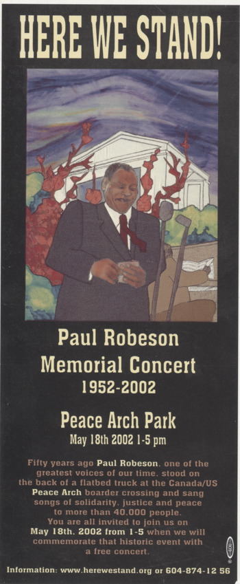 Promotional pamphlet for the 50th anniversary Paul Robeson Memorial Concert held in Peace Arch Park on May 18, 2002 |