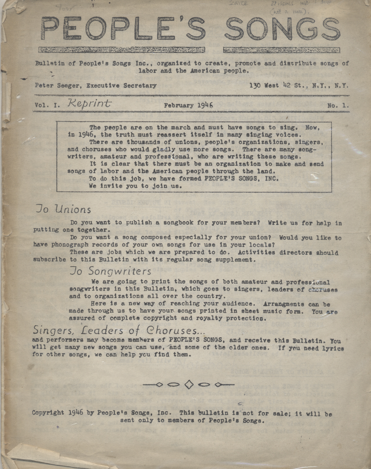 Cover of People’s Songs Magazine featuring Lil Marcus and Pete Seeger, Volume 2, Number 10, November 1947 |