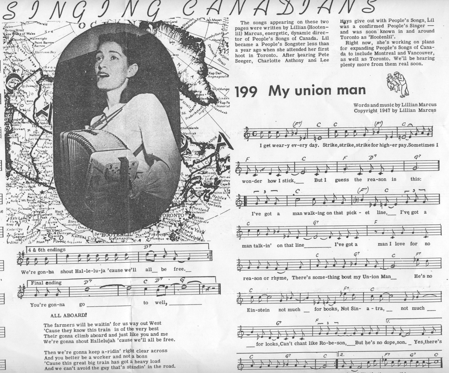 Photo and write up on Hootin’ Lil Marcus along with music and lyrics for her song, My Union Man, in People’s Songs Magazine, Volume 2, Number 10, November 1947 |