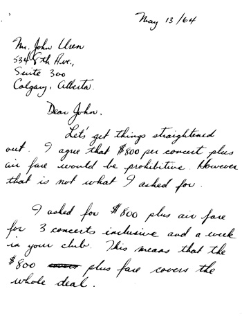Page 1, letter from Gordon Lightfoot to John Uren of the Depression coffee house in Calgary in May 1964. Outlines Lightfoot’s booking rate at the time and also mentions he will soon be signing with legendary NYC agent, Albert Grossman. |