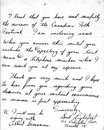 Page 2, letter from Gordon Lightfoot to John Uren of the Depression coffee house in Calgary in May 1964. Outlines Lightfoot’s booking rate at the time and also mentions he will soon be signing with legendary NYC agent, Albert Grossman. |