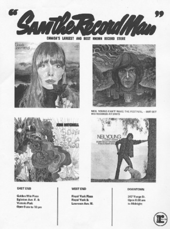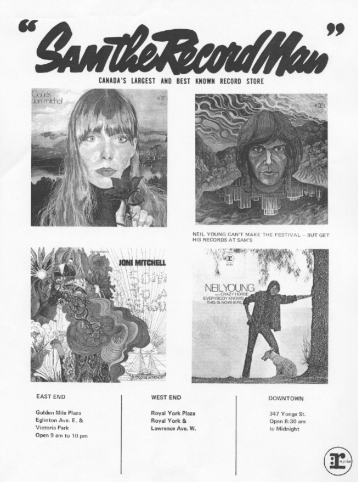 Sam the Record Man ad for albums by Joni Mitchell (Song to a Seagull, and Clouds) and Neil Young (Neil Young, and Everybody Knows This Is Nowhere) as printed in the Mariposa Festival Program 1969 |