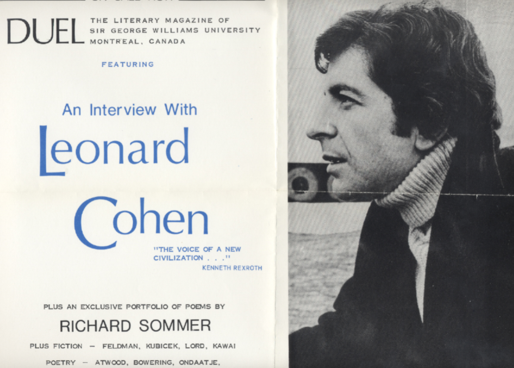 Poster advertising Duel, the Literary Magazine of Sir George Williams University, featuring an interview with Leonard Cohen, circa 1960s |